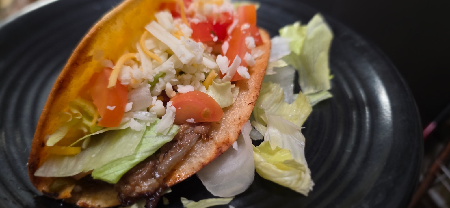 Flour shell tostada with a choice of shredded beef, shredded chicken or carnitas, beans, sour cream and fresh guacamole cream drizzled with Italian dressing