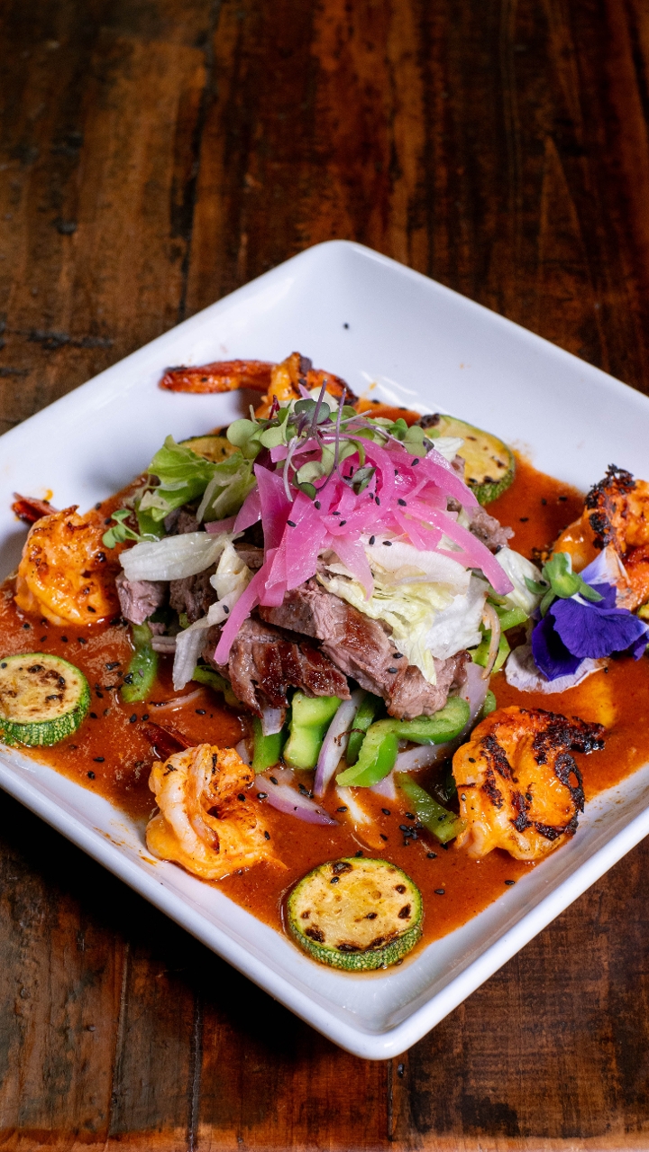 Seasoned and grilled steak with buttered shrimp & grilled vegetables