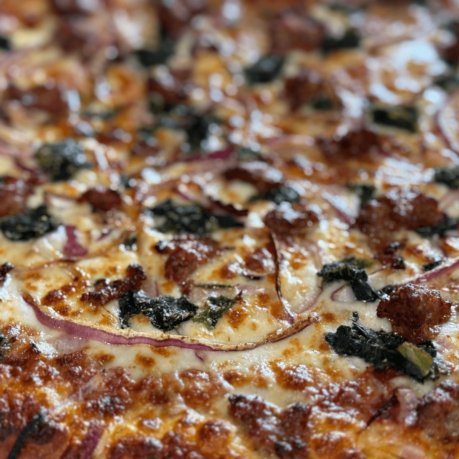 Spinach, Juicy Sausage, crisp red Onions.