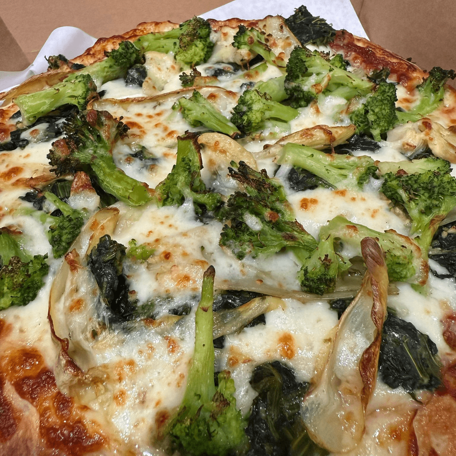 A fresh mix of Spinach, Artichokes, Broccoli, and aromatic Garlic with melty mozzarella Cheese..