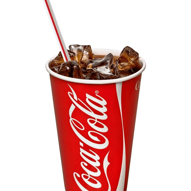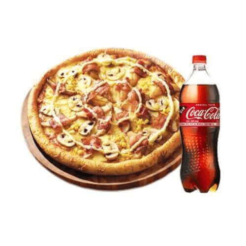 With regular sauce, Mozzarella cheese and Coca-Cola 2-liter soda