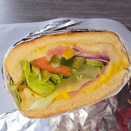 Delicious thin sliced Canadian bacon topped with tomatoes, green bell peppers, onions, mustard, mayonnaise and Mozzarella cheese served on a fresh french roll made to order
