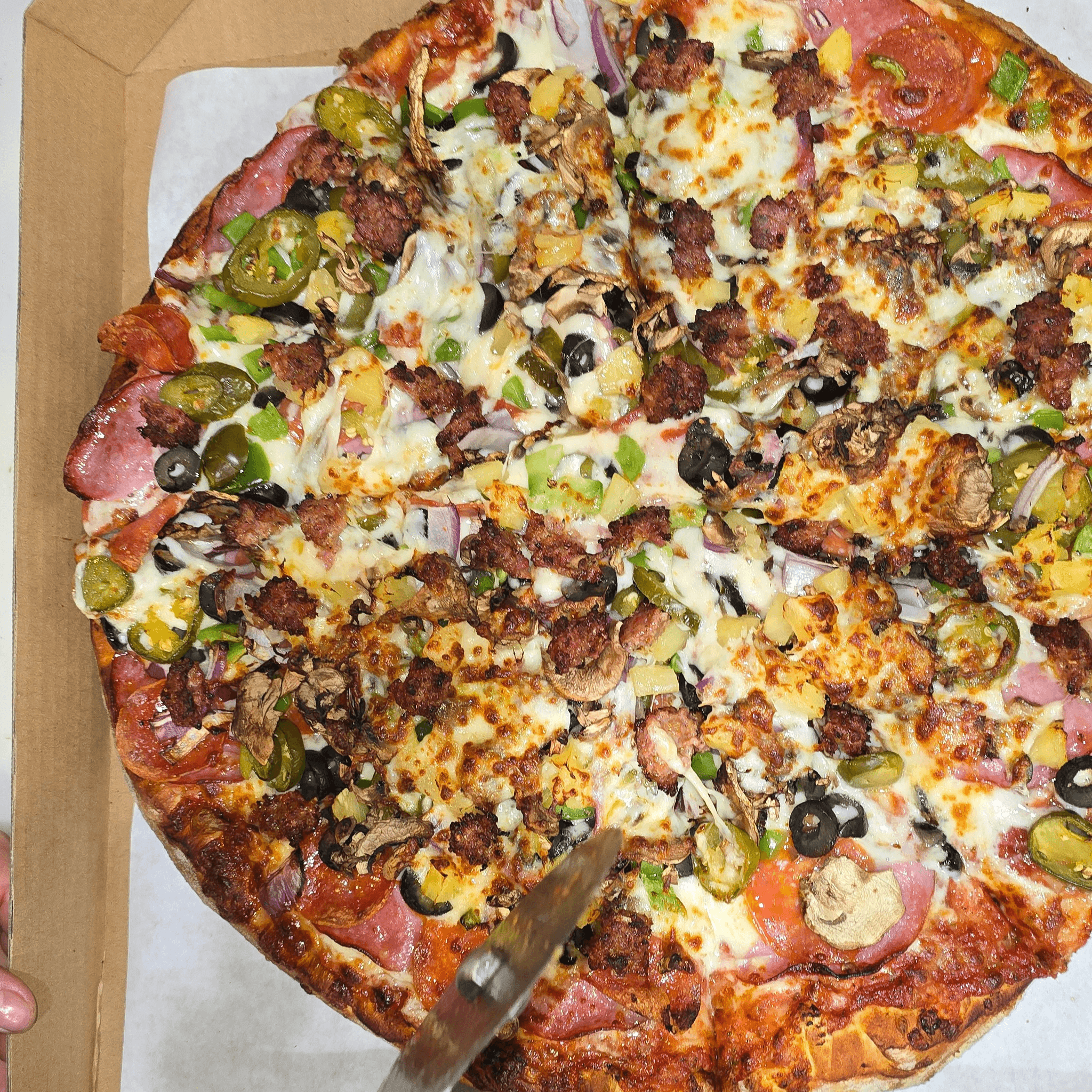 Our deluxe supreme pizza nine topping + extra cheese. Pepperoni, Sausage, Canadian Bacon, Jalapenos, Pineapple, Mushrooms, Onions, Black Olives and Green Bell peppers Better be hungry, because it's big, bold, and fully loaded.