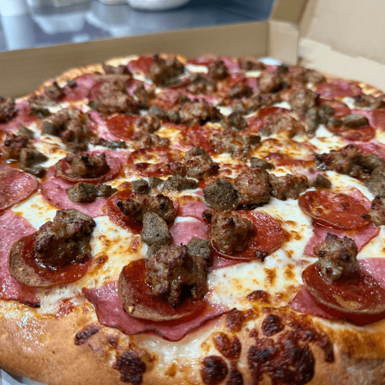 Pepperoni, Meatballs, Sausage, Canadian bacon. All meat, no distractions—four premium meats on every slice.